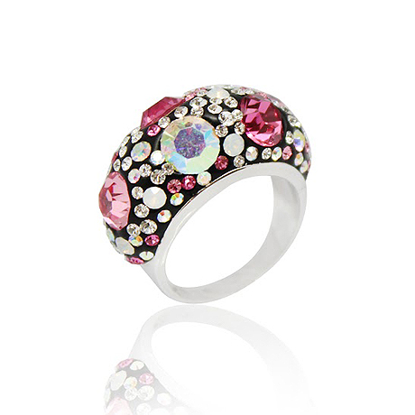 Kleine klare und rosafarbene Swarovski-Kristalle, rund gefasst auf einem rotgold vergoldeten Ring au...